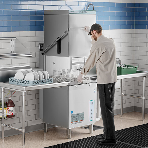 Get spotless dishes every time with this Noble Warewashing low-temperature dishwasher. This dishwasher sanitizes with chemicals to effectively clean your glassware and dishes. It uses only 0.86 gallons of water per rack with a standard cycle that can be extended. Thanks to its integrated chemical pump, it can clean up to 51 racks per hour. This dishwasher's recirculating wash tank uses less water and energy than traditional fill-and-dump models.