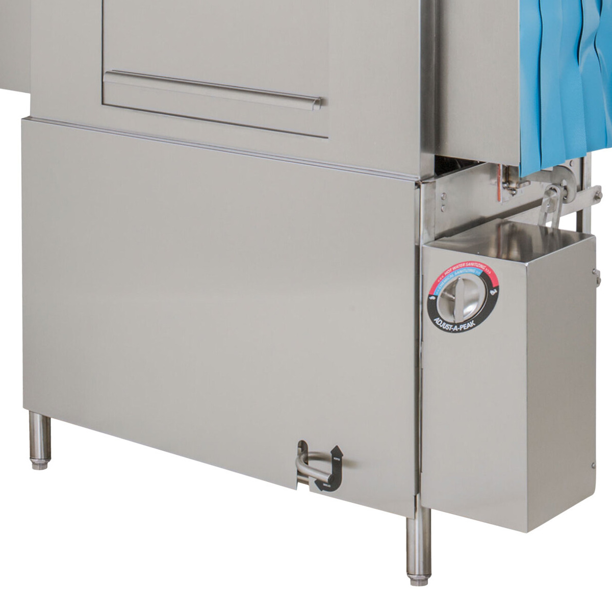 For heavy soil conditions, the Adjust-A-Peak adjustable conveyor speed allows the machine to extend wash time and rinse contact to ensure thorough rinsing.