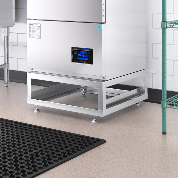 Perfect for dish rooms in bustling restaurants and catering businesses, this undercounter dish machine stand enhances efficiency and employee safety. This stand offers additional rack storage space, making it ideal for maximizing organization and efficiency. By raising the dishwasher off the floor, it allows for easier loading and unloading, streamlining the dishwashing process. Experience less strain on your staff and improve overall productivity in your kitchen with this essential accessory.