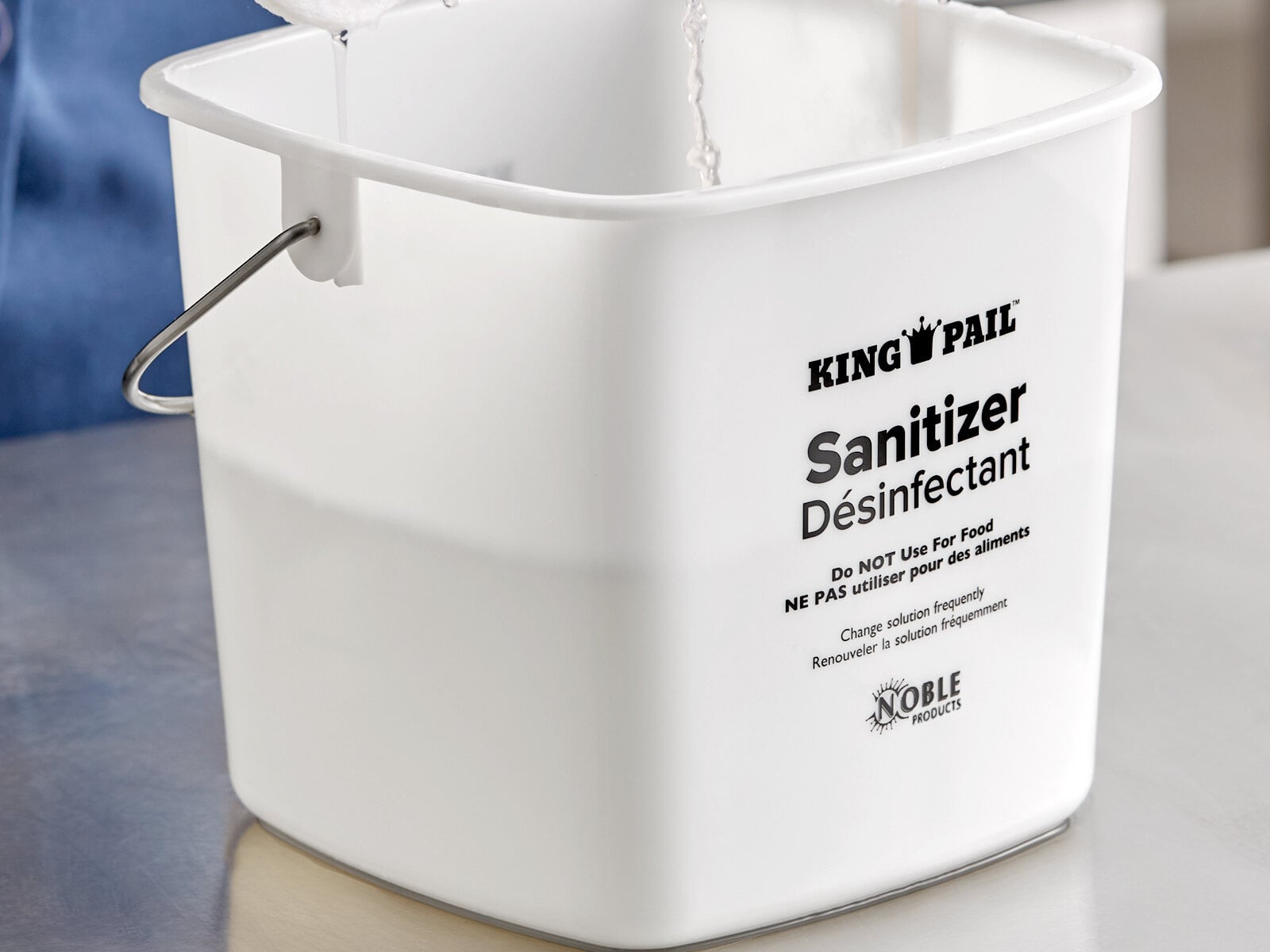This Noble 3 qt. white sanitizing pail features everything you need to ensure employee compliance with health codes. English and French instructions are included on the bucket's front panel, and English and Spanish are located on the back panel. Additionally, the white color helps to avoid cross-contaminating buckets and solutions, and it adheres to HACCP guidelines.